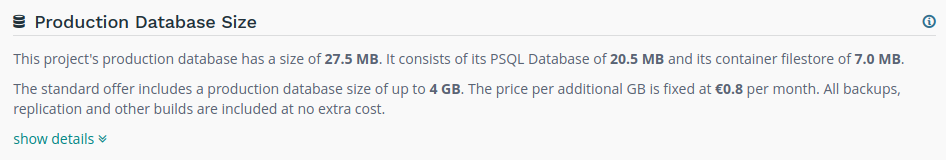 This section shows the storage size used by your project.